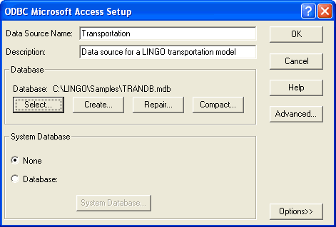 assign the data source the name Transportation in the Data Source Name field. In the Description field, enter "Data source for a LINGO transportation model". Press the Select button and enter the name of the database "LINGO\SAMPLES\TRANDB.MDB" (this assumes LINGO has been installed in the LINGO directory—your installation may differ). The dialog box should now resemble the one shown below: