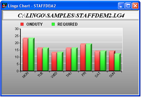 Here we see that we just meet our staffing needs Monday through Saturday and are over staffed slightly on Sunday. Had we not inserted the colon separator between the attribute fields, then LINGO would have displayed the two attributes as a single series: