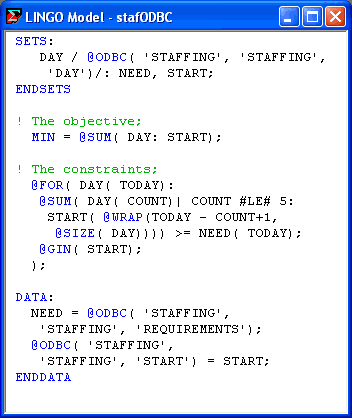 From the model's data section, we see that we are using the @ODBC function to retrieve the values for the NEED attribute from an ODBC data source titled STAFFING. We are also using the @ODBC function to send the optimal values for the START attribute back to the same data source. Because this data source is an integral part of our model, it would be nice to place a link to it in our model, so we can retrieve it easily each time we want to refer to it. We can do this with the Edit|Insert New Object command as follows:
