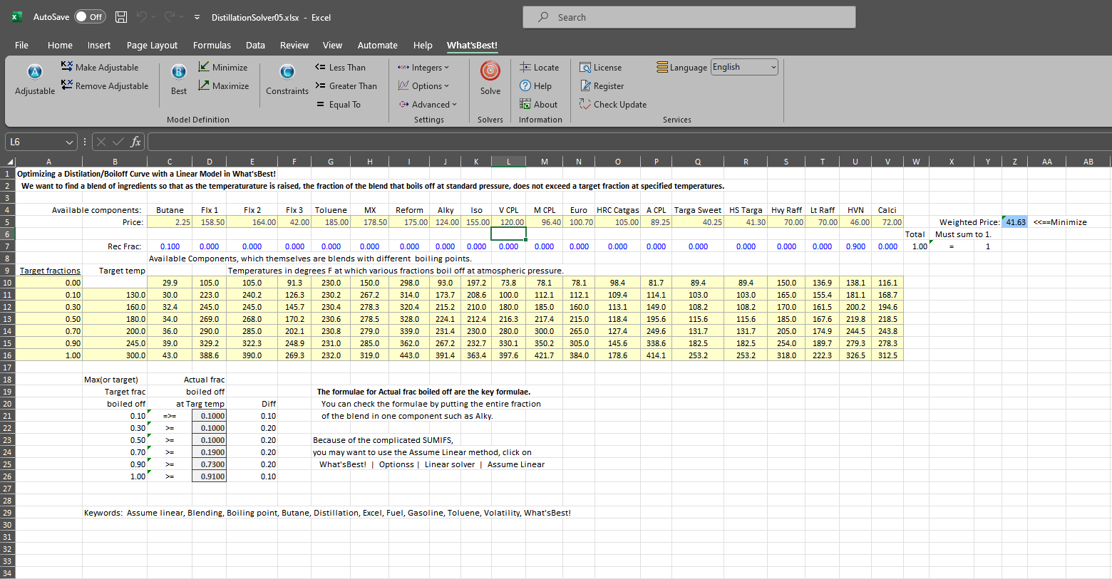 We want to find a blend of ingredients so that as the temperaturature is raised, the fraction of the blend that boils off at standard pressure, does not exceed a target fraction at specified temperatures.