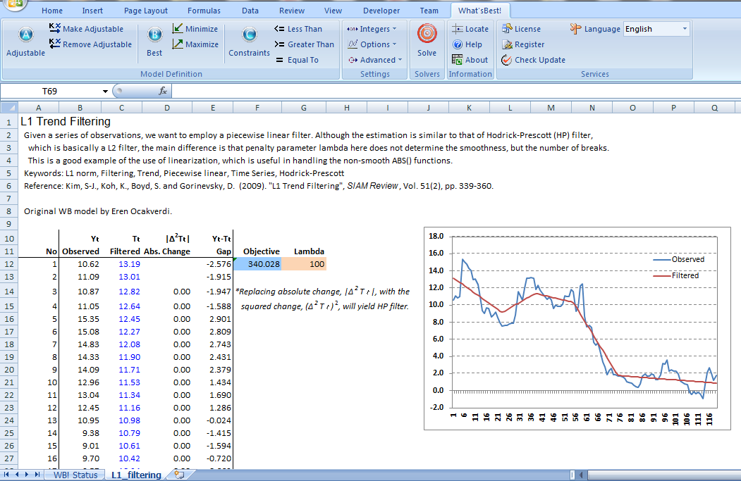 Given a series of observations, we want to employ a piecewise linear filter. Although the estimation is similar to that of Hodrick-Prescott (HP) filter, which is basically a L2 filter, the main difference is that penalty parameter lambda here does not determine the smoothness, but the number of breaks.