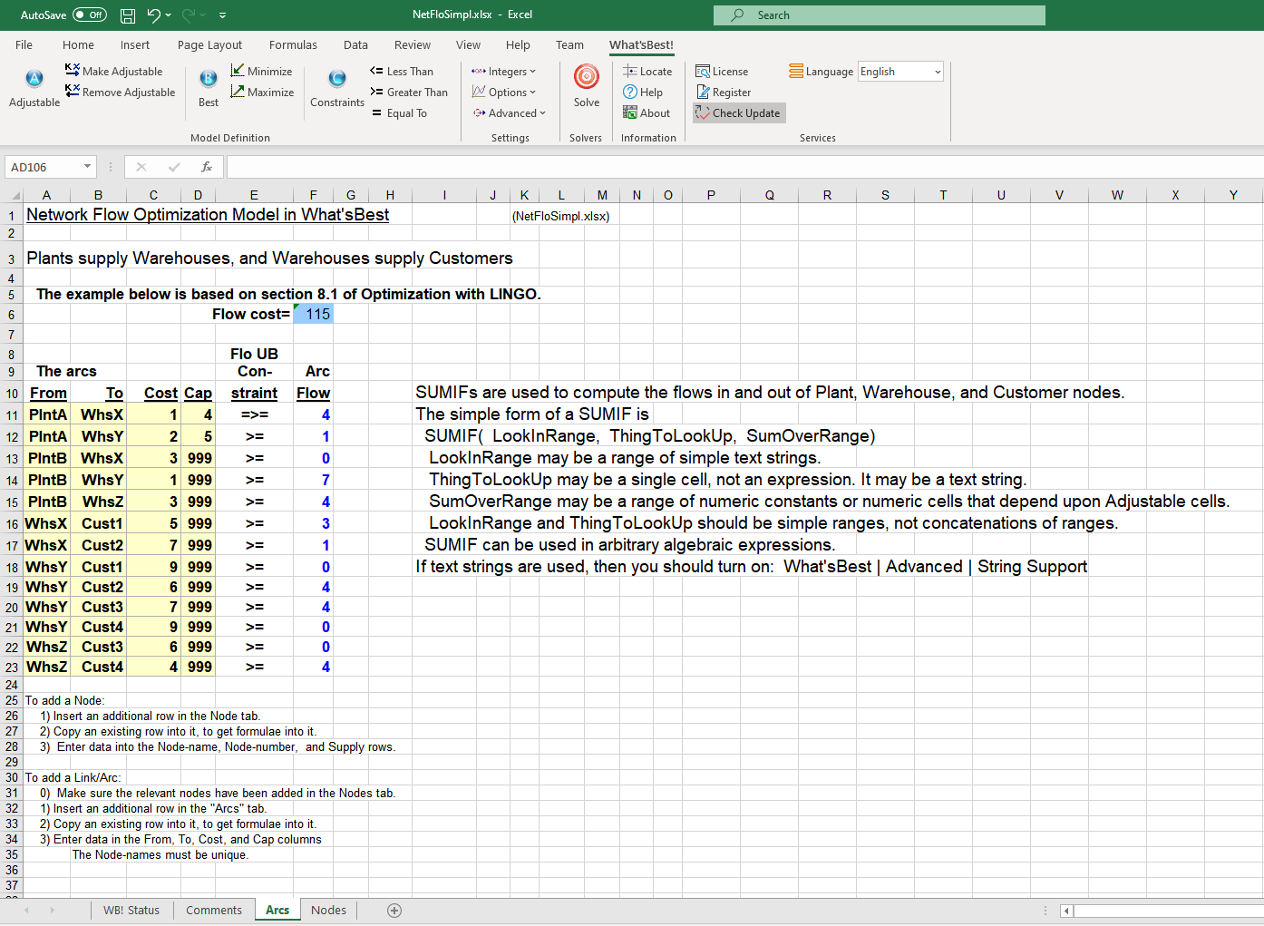Each arc has a From node, To node, Cost/unit flow, and Capacity.