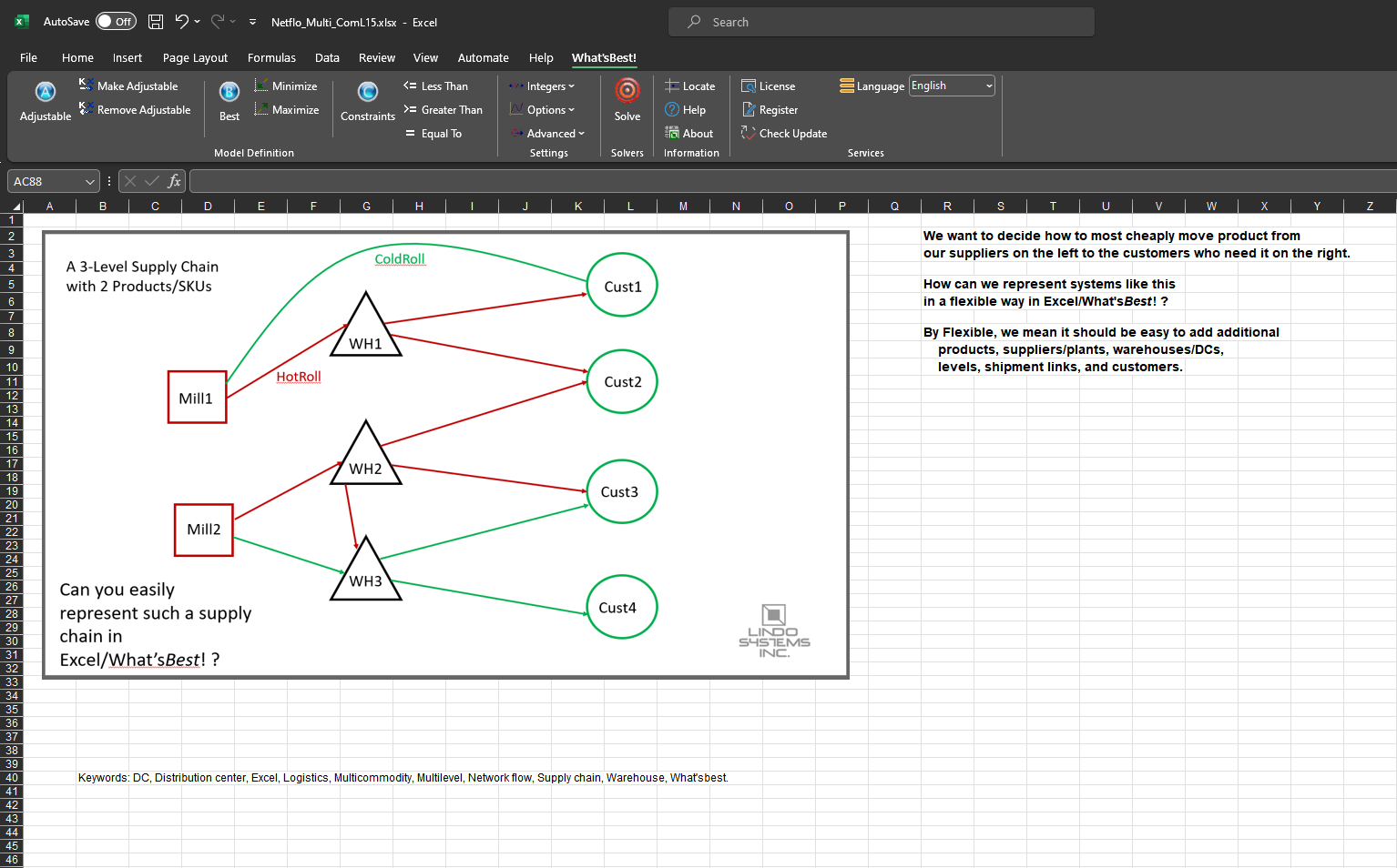 We want to decide how to most cheaply move product from our suppliers on the left to the customers who need it on the right. How can we represent systems like this in a flexible way in Excel/What'sBest! ? By Flexible, we mean it should be easy to add additional products, suppliers/plants, warehouses/DCs, levels, shipment links, and customers.