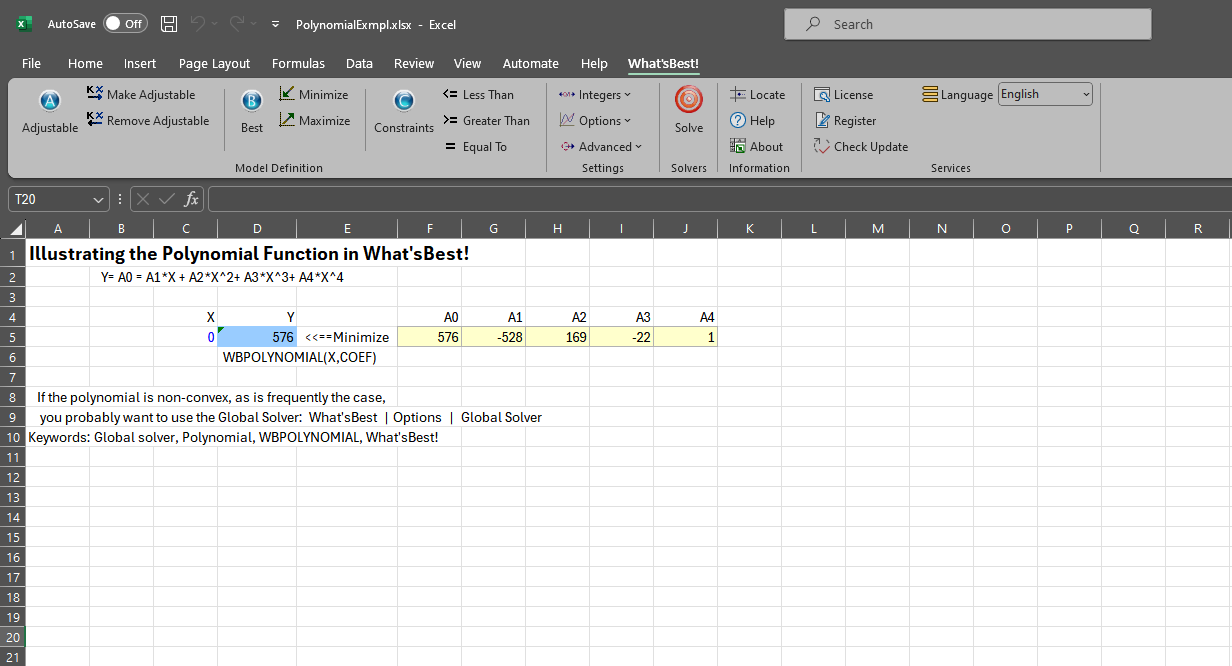 If the polynomial is non-convex, as is frequently the case, you probably want to use the Global Solver: What'sBest | Options | Global Solver