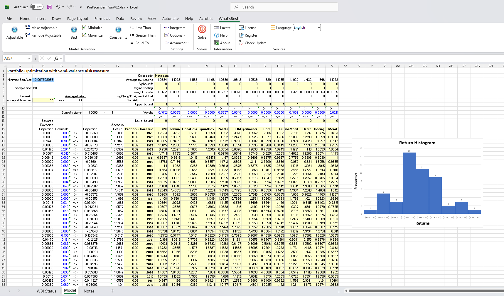 SemiVar is a measurement of data used to estimate downside risk. Calculated by measuring dispersion of only observations falling below the mean i.e., it measures only variability below the mean. Svar = sum(Scenario s: probability(s) * (max(0, ExpectedReturn - ReturnOfScenario(s))^2))